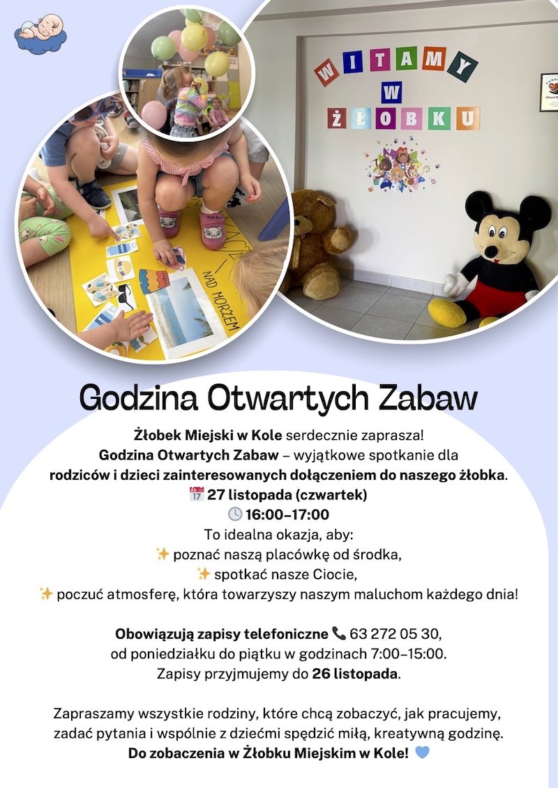 Żłobek Miejski w Kole serdecznie zaprasza! Godzina Otwartych Zabaw - wyjątkowe spotkanie dla rodziców i dzieci zainteresowanych dołączeniem do naszego żłobka.